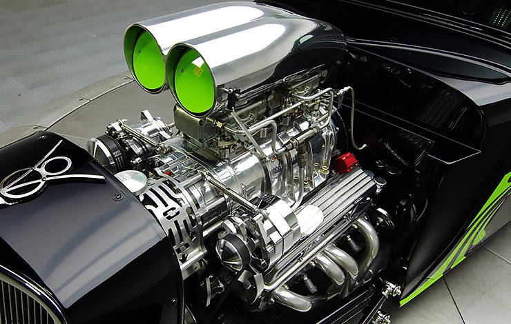 The car is powered by a ZZ350 4 bolt GM Performance Parts crate engine delivering around 600 horsepower on pump gas. The matching lime green butterfly flaps are fitted to the Demon carburetors.