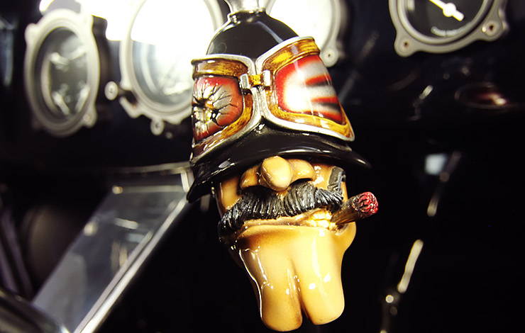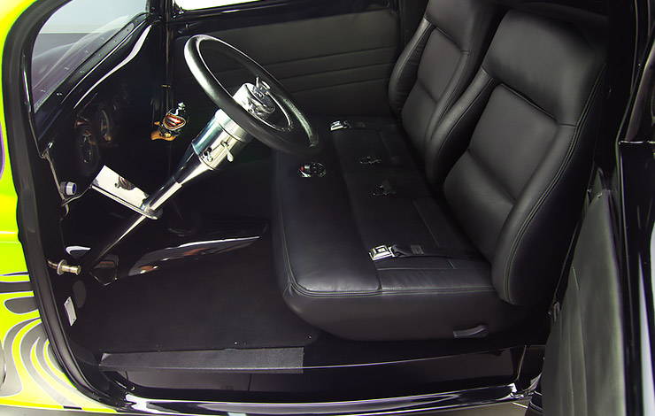 Open the suicide doors and you’ll find black door panels that are stitched in lime green. Inside the car is black leather also stitched in lime green thread. The dashboard houses a set of Classic Instrument gauges.