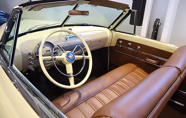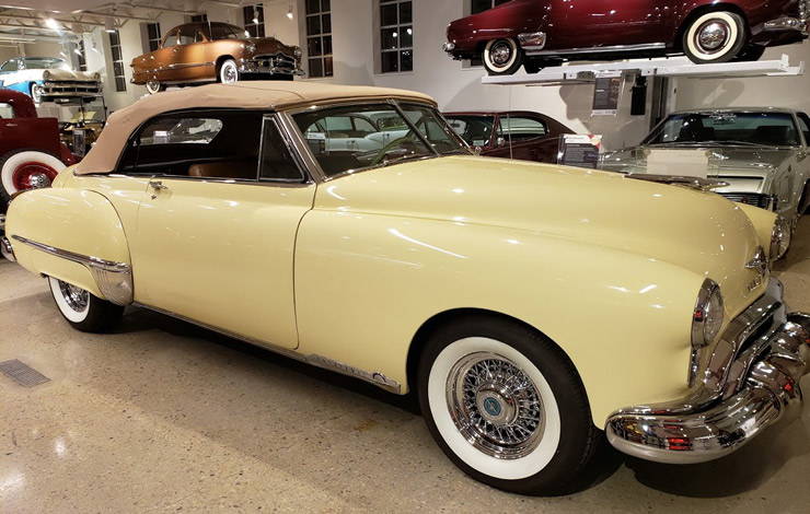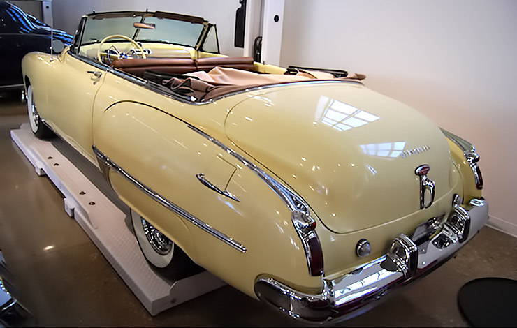The car also has a four-speed Hydra-Matic transmission. Included in its long list of standard equipment are a solenoid starter, fender skirts, an E-Z-I rearview mirror, foam rubber seat cushions, front and rear bumper guards, a vacuum booster pump, a plastic radiator ornament, dual horns, dual sun visors and a cigarette lighter. An optional deluxe equipment package added front and rear floor mats, a deluxe steering wheel, wheel trim rings, rear seat arm rests, hydraulic power windows, a hydraulic power seat and a hydraulic power convertible top. This 1949 Olds has a marvelous, every nut-and-bolt restoration and an interesting history as a former Indy 500 Official Car and parade vehicle.It’s part of the Automobile Gallery museum‘s collection, one of the top automobile museums in the United States. In the video below, the executive director at Automobile Gallery museum Darrel Burnet talks about how everything started, and at the end about this particular Oldsmobile as his favorite car.