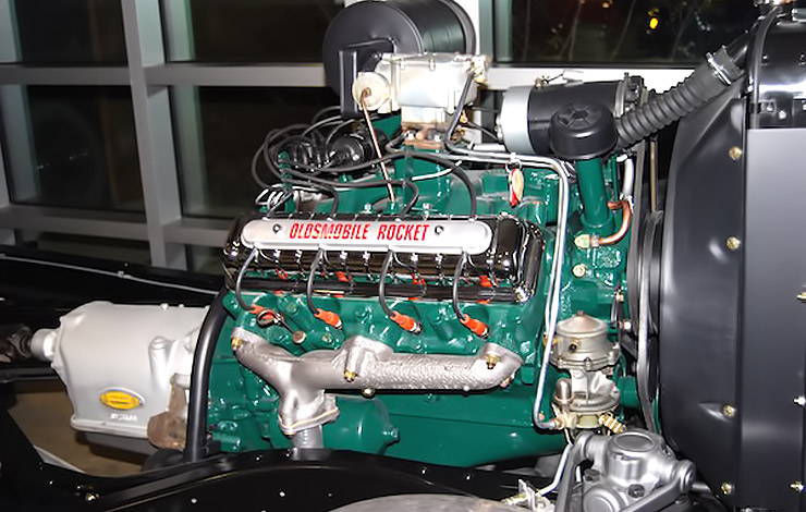 This top-of-the-line Oldsmobile came equipped with the new “Rocket 88” engine (which inspired the first rock-n’-roll song). Тhe engine is an overhead-valve V8 with a cast iron block. Bore and stroke: 3-17/32 x 3-7/16. Displacement: 303 cid. Compression ratio: 7.25:1. Brake hp: 135 at 3600 rpm. Torque: 263. Valve lifters: Hydraulic. Carburetor: Carter WGD 714-S dual downdraft with built-in choke.