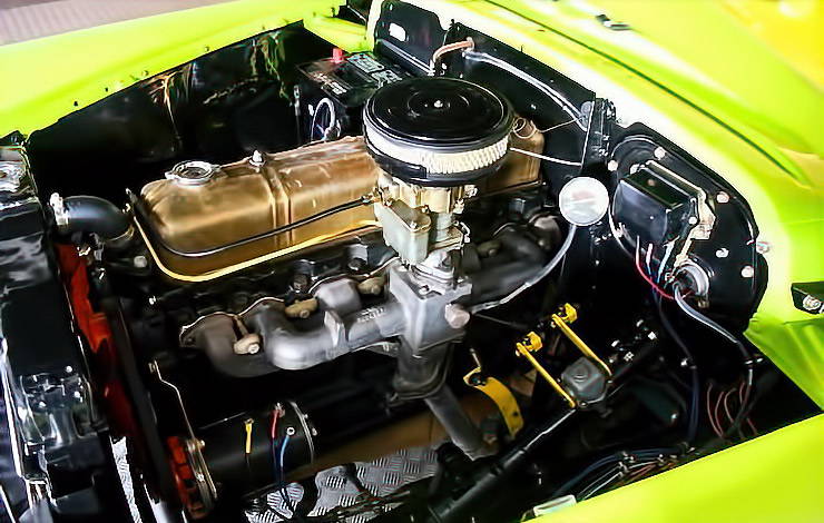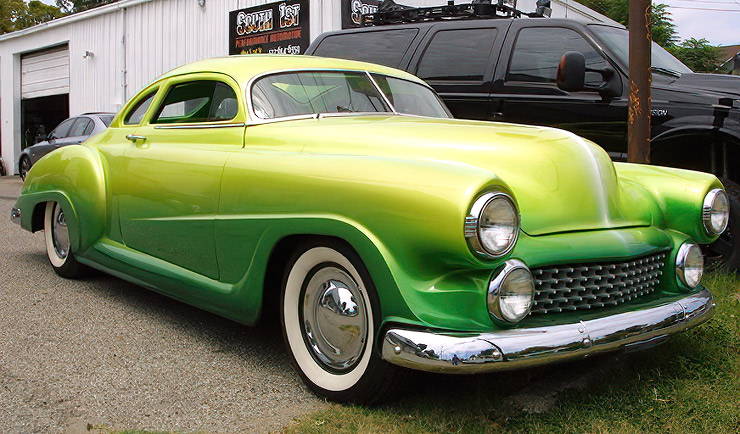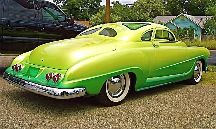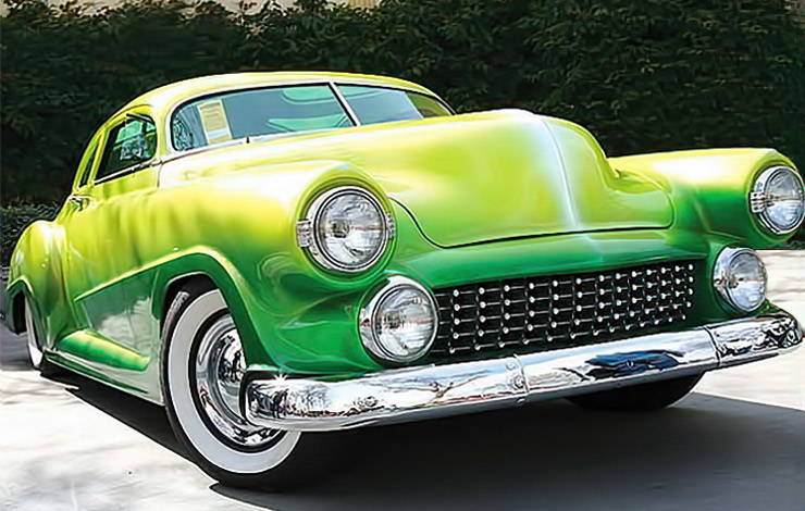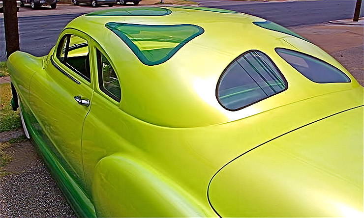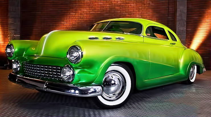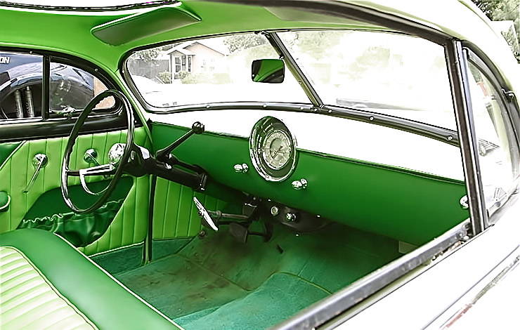 Gene Winfield was known for his innovation in custom painting carefully fading two can colors together called the Windfield fade. When all the changes were complete Gene sprayed the car in that vibrant green paint. The engine is the 216 inline 6-cylinder with a 3-speed manual gearbox.The interior is in tuck ‘n’ roll green in keeping with the light green metallic of the bodywork, the dashboard is revised by stylizing it as much as possible. The wheels mounted on radial whitewall tires receive baby moon hubcaps.