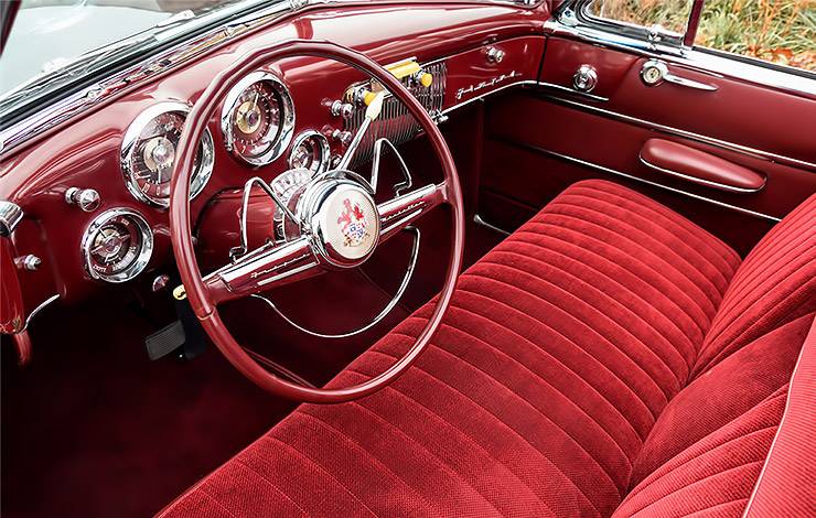 Inside is enough interior space to hold a dance party–or so it seems to those of us who came of age in the era of downsizing. The cabin has a high ceiling, the better to accommodate the well-dressed postwar man’s stylish fedora. The dash is a lovely example of late-period Art Deco/Streamline design.