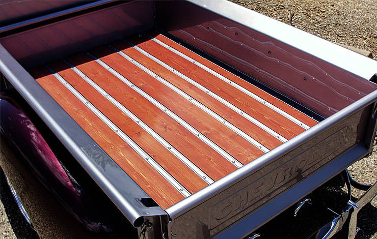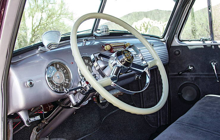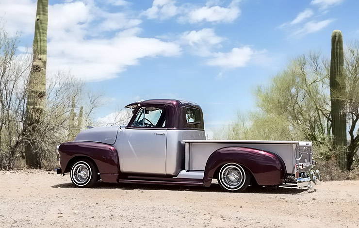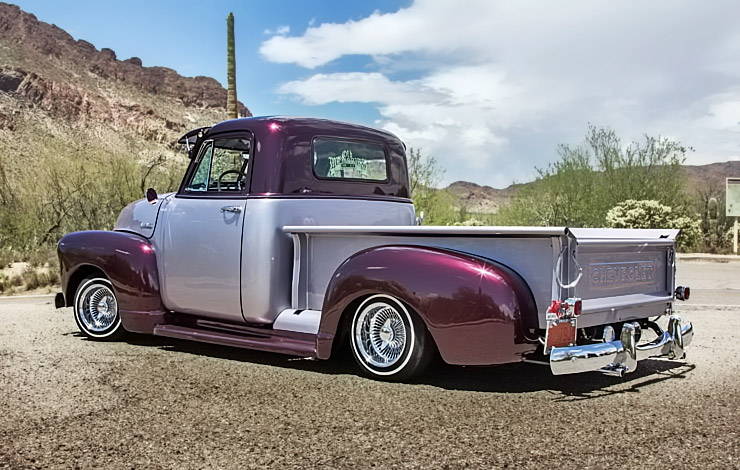 First thing on the list was to lay down the unique two-tone purple burgundy and silver fuchsia-infused custom pearl paint. While Ideal Plating was stripping and chrome plating all the truck’s metalwork, Jose Luis was cutting, stitching, and sewing the cloth interior. Instead of going with the traditional wood-grain finish, Billy decided to continue the truck’s custom look and paint the interior trim a unique blend of gunmetal gray. With the original engine chromed and polished, the final step was saved for Carlos Smith of Chevy Classics in Tucson, Arizona, who would install the custom hidden two-pump hydraulic setup, allowing the truck to lay low enough to scrape that hot Arizona pavement. As a member of Old Memories Car Club since 1996, Billy has proudly displayed his truck in honor of both his father and his grandfather. Billy is extremely grateful his grandfather was able to see the transformation of a truck originally purchased back in 1954 before his passing.Vehicle Year/Make/Model: 1952 Chevy 3100