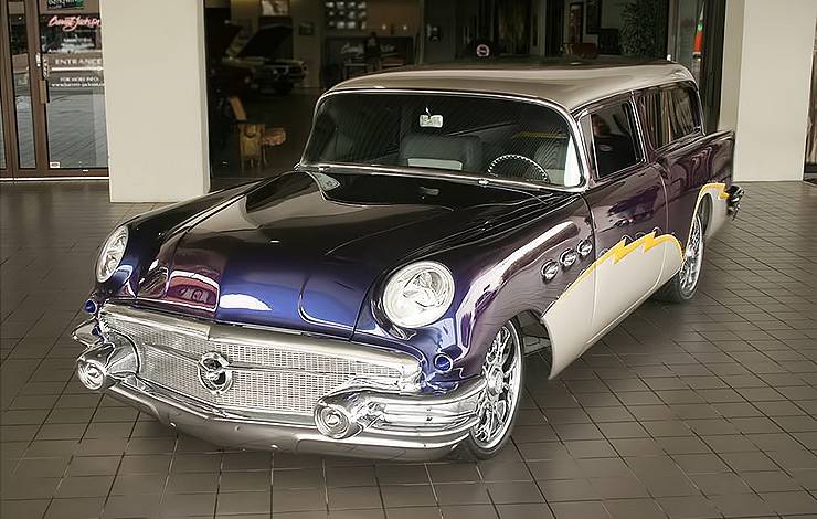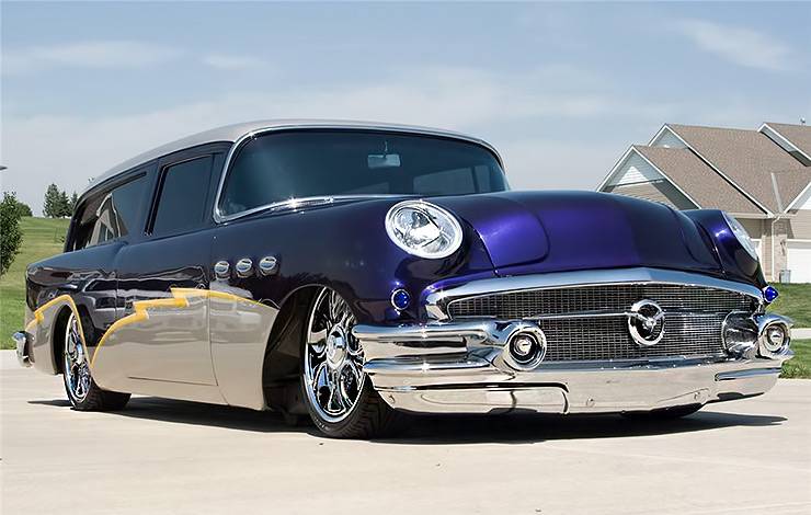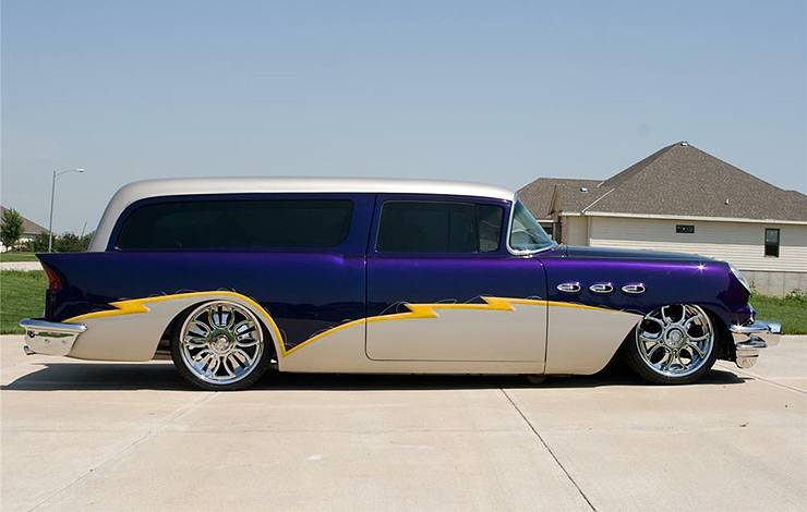 This flashy full custom 1956 Buick Century station wagon was hand-built and designed by a very established and well-respected car builder and repair shop Cars R Us Auto Body Inc. in Omaha, Nebraska.