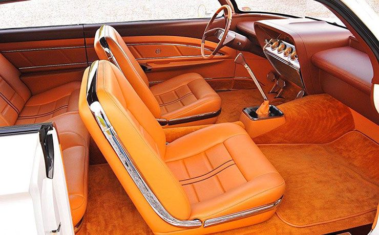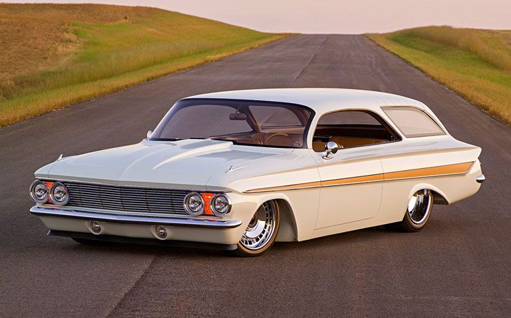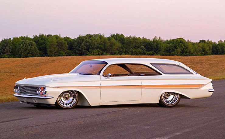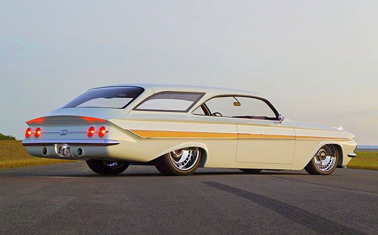 The frontend displays a clean look. thanks to a custom-fabbed Camaro-style bumper and custom driving lights. The rear bumper and taillights were created to complement to looks of the front of the car. On the aesthetic level, Greening Auto Company came in and created several components, such as the machined mirrors, while lights were incorporated into the reworked fender spears. Schott Wheels provided the 18″ and 20″ wheels, custom-built for the 1960s look with contemporary dimensions, wrapped in Diamond Back Classics modified Goodyear Eagles tires. The engine compartment looks equally clean, and hides a 1963 Chevy 409 modified by Carma Performance. The engine is fed by a custom EFI setup and was mated to a five-speed Tremec with a McLeod clutch. Inside, you will find stretched tan leather over the 1961 Cadillac Eldorado seats, trimmed with chromed aluminum. Lighting was incorporated into the custom armrests and the dash was hand-fabricated to be an updated interpretation of a 1961-1962 Chevy. Please note the Classic Instruments gauges, Vintage Air A/C system and more awesomeness. Amazing build, no doubt about it, with unmatched quality throughout.
