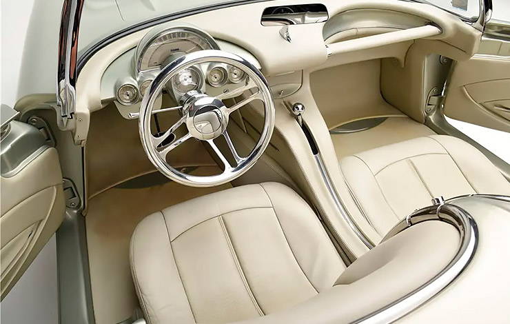 For the Corvette’s interior, Martin custom-made the seats, door panels, console, trunk and headliner with matching spears. The interior also features custom one-off Classic Instruments gauges.