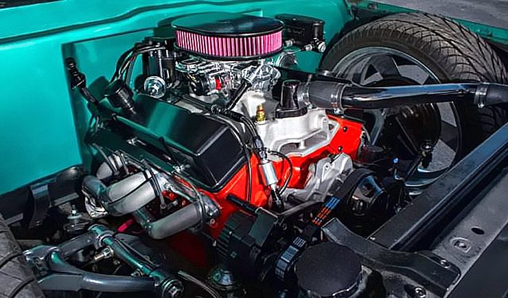 With the majority of the wiring completed, next up was handling all of the air suspension and plumbing duties. Travis mounted the complete AccuAir e-level management and finalized the rest of the wiring. One thing leads to the next and he worked day and night to dial in the rest of the plumbing for fuel, brakes, and was fairly close to getting to fire up the new 355-cubic inch V-8 crate engine. Not wanting to let the project stall out, he moved to the confines of the cab and began to slowly “spruce up” the interior, while still keeping that original look and feel. A few powder coated accent pieces, Dakota Digital VHX gauges, and a Billet Specialties steering wheel brought just enough modern comforts into the cabin for cruisin’ duty. When everything was as close as Travis could get it, he called in the troops to help work out the bugs and get everything running smoothly. His friend Carson helped to tune the engine and with a little luck on his side, everything was up and running.