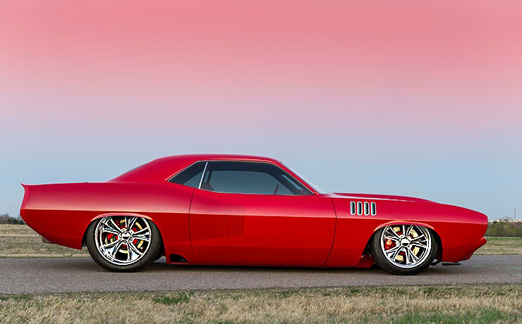 The front and rear valences are custom-made and molded into the body and bumpers, all the glass is flush-mounted to the body, and the entire body is channeled down over the custom frame. Drip rails, door handles, locks, and side markers are all shaved, and the front fenders are extended down two inches. Jesse spent more than five hundred hours putting the interior together, including building the custom instrument cluster. The only stock thing you’ll find in the interior are the door handles. The specs on this ride are as impressive as its appearance. The flawless E-body has received countless mods, it sits on Art Morrison chassis, spins a Nitrous wheels by Foose Design and is finished in smoking hot Red that break necks. The full custom interior of the 1971 Plymouth Cuda “Striker” is as impressive as the rest of the car and is all Red as well. The power comes from a Magnuson Supercharged 6.1 Liter HEMI V8 backed by a NAG1 Auto transmission.