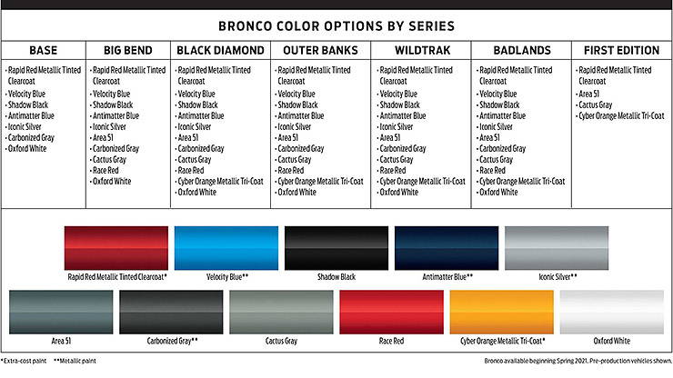 Seven unique Bronco series are offered, with matched color and trim combinations. When combined with four content packages, numerous available options, 11 color choices and more than 200 dealer-installable accessories, personalizing an all-new Bronco SUV has never been easier. There are some fun colors and not all colors are available for all trims. See the chart above for all color/trim options.