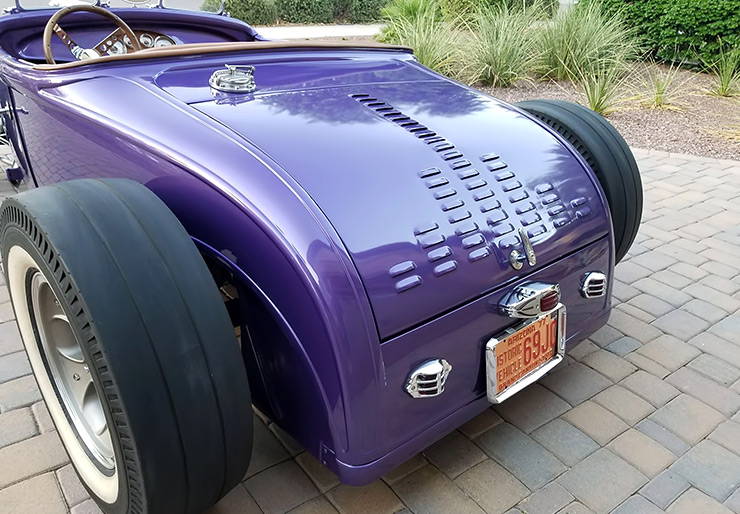 Although the body of the car was in good shape, the four-person build team replaced both front cowl panels, shaved the gas filler and modified the top of the cowl. The original Model A rails were boxed and swept in the front for 3 inches of drop. The back of the frame was Z’d 14 inches. The motor mounts, tubular crossmembers, and suspension were made in-house at Bear Metal Kustoms.“We had an awesome Oakland art deco grille that we wanted to use for inspiration for the car,” said Jason. “We used the top of the Oakland grille and mated the top of the original Ford grille to it but flipped it and put it on the bottom. We shaved the filler hole and smoothed it out.” The team louvered the custom hood and rear decklid so that it followed the lines of the grille. “We continued the art deco feel with the grille insert and the Electroline headlights, taillights and Pathfinder center light,” Jason said. Under the hood, the team placed a small-block Chevy V-8, a custom 3 x 2 intake and a T-5 five-speed transmission with a hydraulic clutch. Once the car was assembled and running, the build team realized they’d have to make some adjustments.