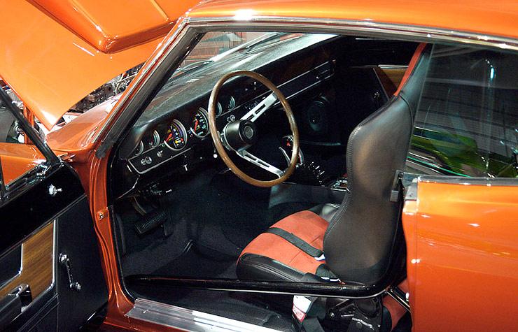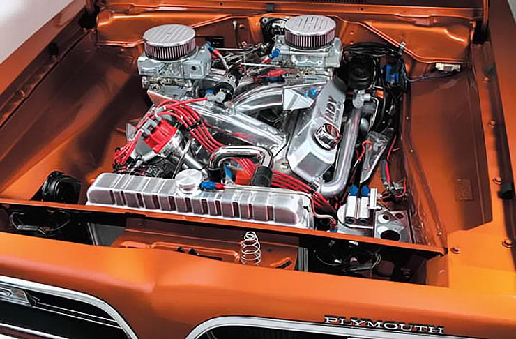 The green interior didn’t work with the new paintjob, so a call to Legendary changed it all to black. Bill customized the dash with an aluminum insert and Autometer dials. There’s wood veneer on the dash and console to match the ’69 deluxe door panels.Bill drives the ’Cuda to local shows and cruises but hasn’t run it down the strip. He says he’s one of those guys that if something bad is gonna happen, it’s gonna happen on his first run. And as far as Bill’s wife with the Camaro, he had her trade that in or, as he told her, he would trade her in. So, says, Bill, “I brought her over from the dark side.”