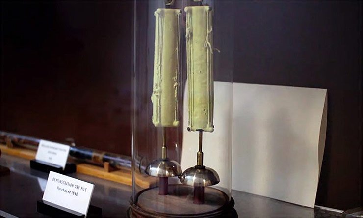 The mystery of this battery is exactly what’s inside. We know that it is something called a “dry-pile” battery, a precursor to the modern “dry cell” battery that gains some of its longevity from using the smallest amount of liquid possible to sustain the chemical reaction needed to generate power. Dry piles were invented by a guy named Giuseppe Zamboni (no relation to the ice resurfacing company) in the early 1800s.