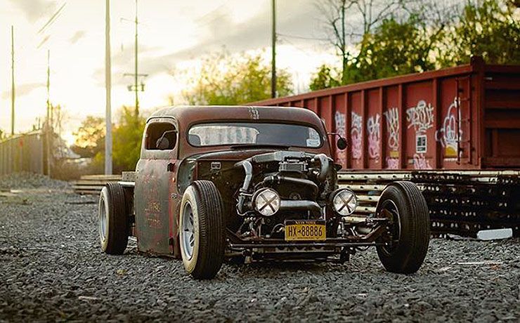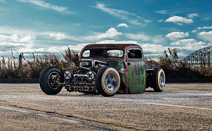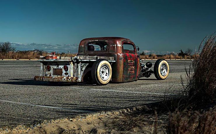 We’re talking about Chris Lee’s ’49 Ford that’s powered by a 1JZ Toyota engine, Nissan 6spd transmission and a chassis built entirely from scratch. And yes, you are right – it look downright blasphemous.Chris is a very talented photographer but he is a home grown fabricator too. From top to bottom, this customized post-WWII-era Ford pickup is all Chris’ handy work.