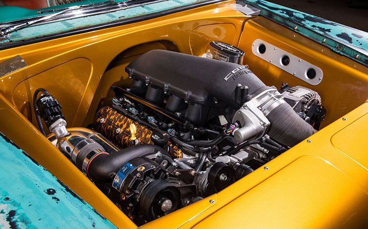 The ’55-’57 Chevy has always been one of the most popular platforms for racers and customizers, and it’s great fun to see how builders go about creating examples to stand out from the crowd. From a field in Memphis to the Mobil 1 booth at SEMA this car certainly do that.Retro Designs Speed & Custom in Concord, North Carolina was commissioned by Chevy Performance’s The Block to built this 1956 Chevy Bel Air Sports Sedan. The project is called Boosted Bela and as the name suggest the engine is not naturally aspirated.
