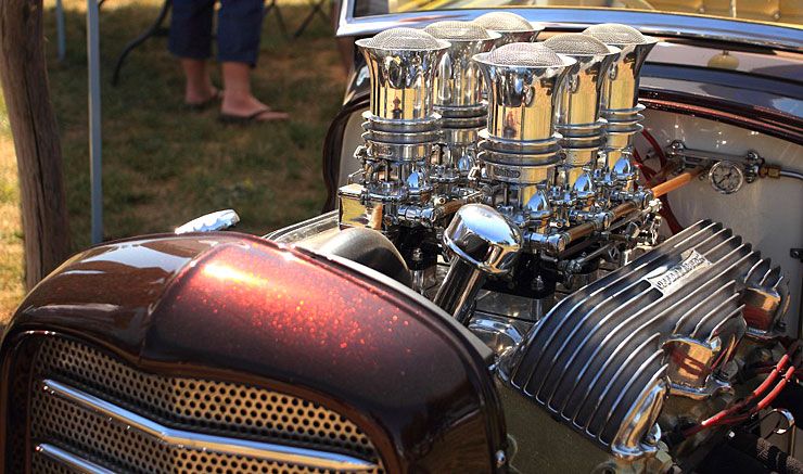Powering Brown Sugar is a 348-cube, Chevy W-series engine – Chevrolet’s first big-block.“ Around this era, rods were built with Olds, Caddy, flathead and lots of other V8s,” says Richard. “I wanted something different. In 1960, the W was only two years old and with its uniquely-scalloped rocker covers it was very cutting edge.” Crowning the W are six perfect-reproduction Stromberg 97s that cost around $600 each! These are bolted atop a genuine (and rare) 1960s Edelbrock manifold.