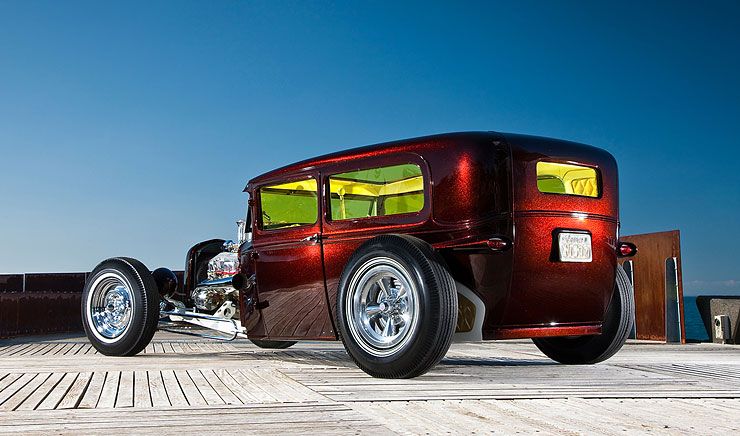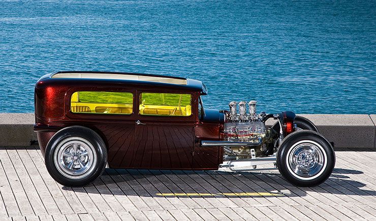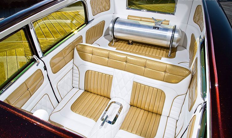 “It’s 60s nutso show car theme in there,” says Richard. “It’s got everything; over-the-top color combination, diamond pleat, tuck ’n’ roll, the whole box ’n’ dice.” To make that gold and white interior pop just that little bit more, the window openings were filled with yellow-tinted Perspex. When it came to deciding on a dash, Richard knew exactly what he wanted. “Oldsmobile have some of the coolest dashes around,” says Richard. “This one is out of a ’56.” In its raw form, the Olds dash is about 10 inches too wide, so Richard had to cut the ends off as well as ditch the original center section. To re-join the two ends, he had a one-off, finned center panel especially cast, which was then machined to accommodate the three accessory gauges. If you didn’t know better, you’d swear it was factory. To create the phenomenal hue, good mate and House of Kolor brand ambassador Mat Egan first laid on a base of custom-mixed HOK Galaxy Grey and HOK Black. Next up was the Shimrin2 Pale Gold Metajuls (course metal flake), followed by the sumptuous HOK Root Beer Kandy. To make it all shimmer, Carmine De Maria from C.A.D Customs flow-coated the whole lot in HOK USC01 Show Clear. To contrast with this, the chassis, undercarriage and driveline was painted off-white. While on the inside, Mat took some HOK Shimrin2 F16 Light Gold Flake and color-matched it to the vinyl. As a tribute to the glory days of the 60s, Brown Sugar is a stunning success. It’s also a stunning piece of automotive machinery in its own right.