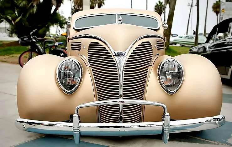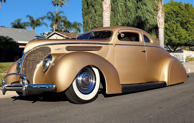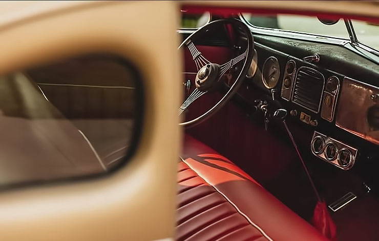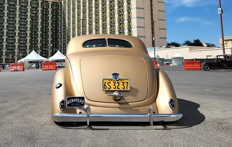 After the bodywork was finished and primer done and ready, the idea of colors was the next conversation. Once again, being a fan of Mike’s work, Roger really wanted to know his suggestions. The sheen would be satin to show off the flowing curves of the Art Deco body, and two colors were suggested. Mike offered Gold or Champagne Satin from Kustom Shop. Roger picked Champagne, to Mike’s approval, the irony being that Mike already knew what color he was going to paint the car. An artist knows his canvas. Like everything when it comes to project, it’s always evolving and sometimes it can snowball. Noting how well the car had come along and with the fresh chop and paint, Mike suggested they should go ahead and do the interior. They both loved how the original rusty and chipped dash looked over decades, so they felt that should stay. A deep red tuck and roll leather interior was installed, brightening up the inside of the car. The contrast with the satin gold of the body makes a beautiful blend, and was the final touch for this part of Roger’s build. It only took Mike about seven months to get the chop done, the paint ready, and the interior done, making a radical change from the car Roger handed over. The final result is a beautiful pre-war car with enough subtle custom touches to make it stand out, but yet still remain elegant and classy. Roger trusted Mike’s skills and got exactly what he wanted; a unique Bello’s Kustom that seriously stands out from the crowd at any show. Only time will tell how the car will keep evolving, because as we know, no project is truly ever done.