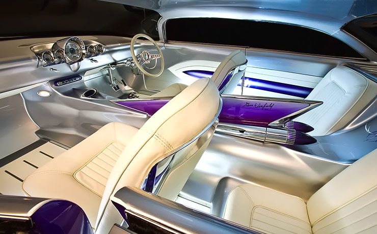 Mario stayed true to the original plan of fabricating his own mono construction chassis: “It all started to evolve after TJ at Camden County Customs chopped a serious five inches out of it and grafted the body to the chassis”, Mario explained, “I drew up plans for a full metal, hand-sculptured interior with the idea of a ’59 fin incorporated into the console and being used as an interior light. Even the roof lining is metal, using another ’59 roof as the headliner.” The donor car – a 1959 Cadillac Coupe De Ville – was found in the corner of an old friend’s workshop. “It sat on three wheels, had no front sheet metal, no motor, no interior, and the roof had been cut off and was leaning against a fence. It was perfect.”