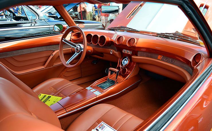 Starting with the engine, Dave shied away from today’s popular LS trend, and instead went traditional with a 383 stroker built by AG Industrial Machineworks in Norfolk, Nebraska.Lemons ceramic, silver-coated long-tube headers relinquish waste through a custom-bent Boesch 3-inch crossover exhaust system. Flowmaster 44 mufflers slightly tame the stroker’s 400hp growl. A GM 700-R4 transmission and shift kit manage shifting duties while a 3,000-stall converter ensures aggressive launches off the line. The seemingly infinite customization continues on the exterior where Dale sprayed the body with eye-catching DuPont Hot Hues Copper Sunset Pearl then added Eggshell stripes cleared over with DuPont Gold Mist.Beyond the stock ’69 console and shifter, a fully custom Boesch interior features a plethora of one-off goodies and fancy gadgets that will send most any Camaro purist into a four-letter frenzy. Both exterior and interior is a work of art and the rest of the car also showcases an amazing example of top-notch craftsmanship.