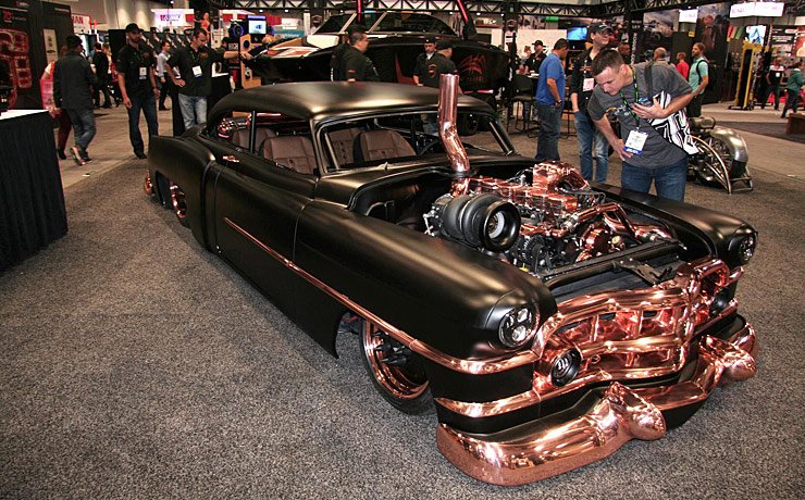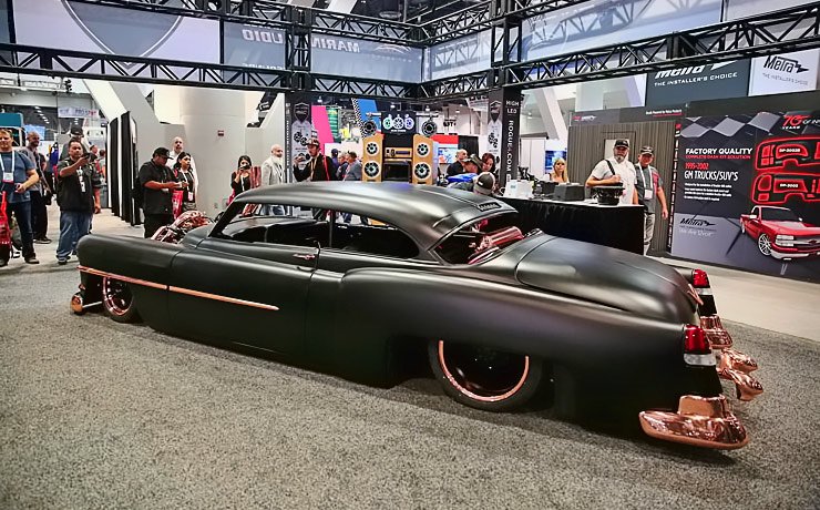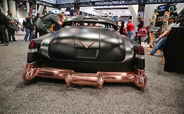 This glorious machine started as a 1950 Cadillac coupe and has been chopped and reworked from the ground up to create a genuine one of one type vehicle. Every single body panel has been either stretched, chopped, or modified in some way, shape, or form. Once all that was completed it was painted in that sinister black suede with the eye-catching copper accents.