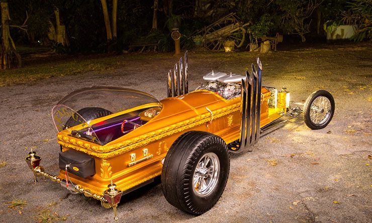 To recreate the look, David scored a pair of 18-gauge steel coffins, which he shortened and widened to get the proportions just right. They were decorated with resin trimming and real coffin handles before Josh Carono of Swains Motor Body Repairs laid down that eye-searing House of Kolor Pagan Gold.