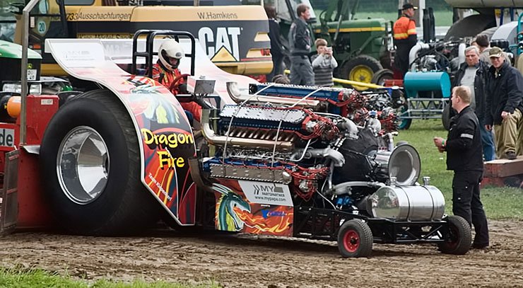 If you don’t know, tractor-pulling is an odd sport where you hook a tractor to a weighted sled and try to pull it a specified distance (usually 300 feet or 100 meters). On top of the sled is as sliding weight which is geared to the wheels so that it moves forward in proportion to the distance pulled, making it harder the farther you pull. Unsurprisingly, that takes a lot of power. I’ve seen pictures of tractors with as many as five or six supercharged V8s, tractors with 18-cylinder radial engines, tractors with two diesel V12s, and tractors with helicopter turboshaft engines.