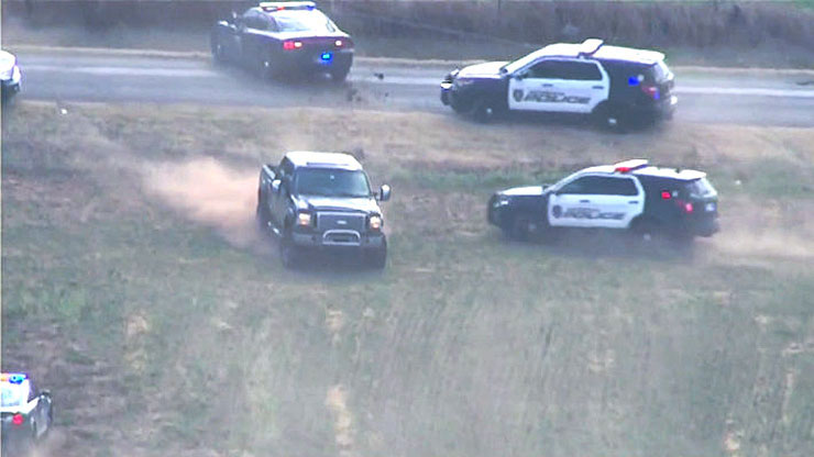 At least three crashes caused by this chase have been reported, according to authorities.After being hit and escaping from several patrol vehicles, the driver left that field, crossed a road and went into some thicker brush. At one point, the pickup truck appeared to be trapped while driving up onto the roadway and facing a ditch. The back of the truck was hit by a patrol car, which spun the pickup around. It came to rest facing the field once again, and the driver sped through a group of police cars and escaped.