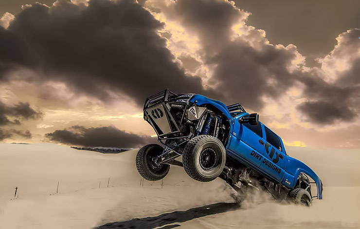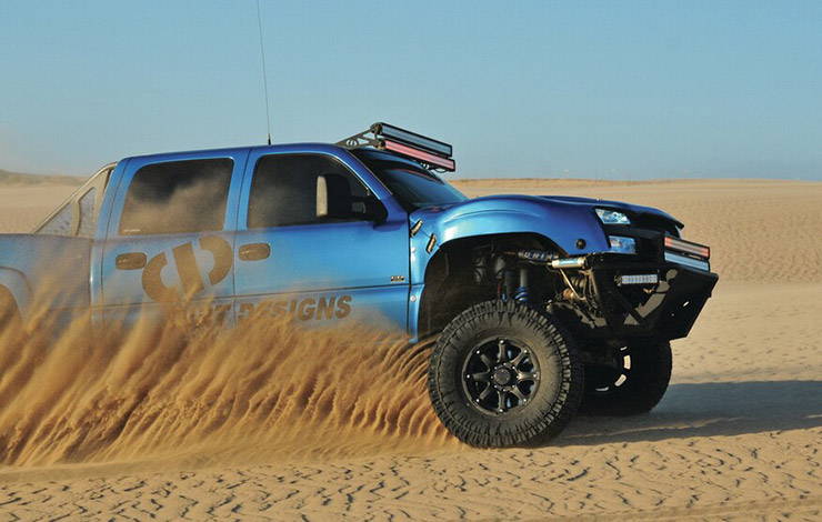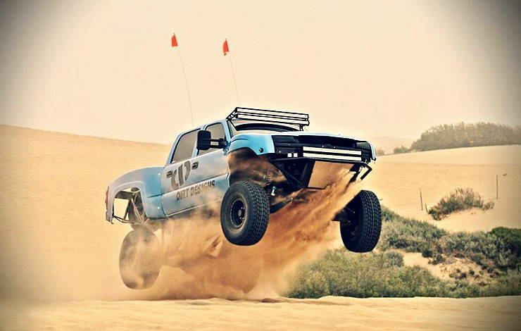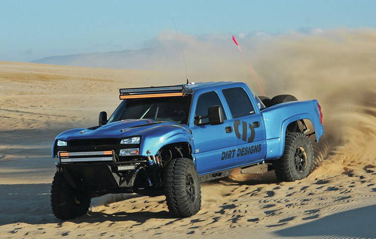 It’s quite a sight to see something like this take flight, though it was never the planned. Austin Lessel is a big fan of running hard over the dirt and sand. When he was younger he was all about quads and dirt bikes. Now that he can drive, he’s able to run full-size trucks over the loose terrain. Austin was running an Avalanche because he kept breaking suspension parts, so he decided to trade his gas-powered truck for something that wasn’t so tempting to beat on in the sand.He picked up a 2006 Silverado 2500 because it’s heavy, and trucks like this are difficult to build for extreme off-road use. However, when you have a passion for driving over sand and live only a few miles away from the dunes in Pismo, California, temptation can only be avoided for so long.