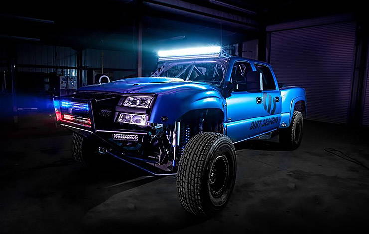 On the rearend, Dirt Designs chopped off the back-half frame to get the maximum amount of deflection. Basically, they took an American Axle Manufacturing rearend and figured out where it needed to be and how high up it was going to move. Then the frame was made out of round steel and the rearend was trussed to make it stronger.Tackling the rear suspension, a triangulated 4-link was made for the 30 inches of travel. A matching set of King Off-Road Racing Shocks coil-overs, bypass shocks and bump stops were added. To make the frame rigid and keep Austin safe, a complete roll cage was made out of 2-inch round steel and runs from the front of the truck to the rear. With all of the suspension modifications, some of the factory body panels wouldn’t fit the style or the function. The truck received a Trailer Products one-piece front end, while Fiberwerx Offroad Fiberglass Trophy Truck series bedsides were custom molded for the shortened rear wheelbase. The front also got a 2-inch front bumper with a pusher from Dirt Designs in case any problem objects get in the way. To light up the path, several Rigid Industries LED lights fit with custom mounts have been installed. Then Torlief Karr wrapped the entire body in metallic blue 3M vinyl. For a better footprint, a set of 17-inch Method Race Wheels 105 beadlocks were added with 39×13.50R17LT BF Goodrich tires.