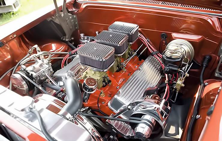 The engine is a 348 cubic that is connected to a 2 Speed Powerglide Transmission both of which were available in 1958. The engine is connected to a Tire Warmer Exhaust System that features Flow master mufflers.