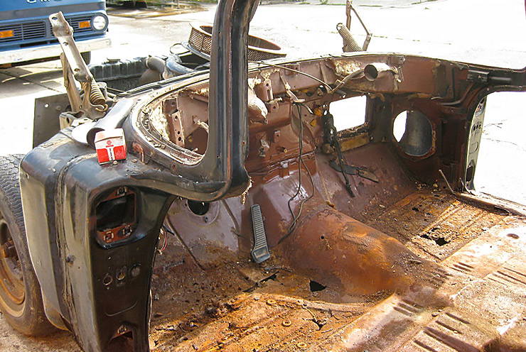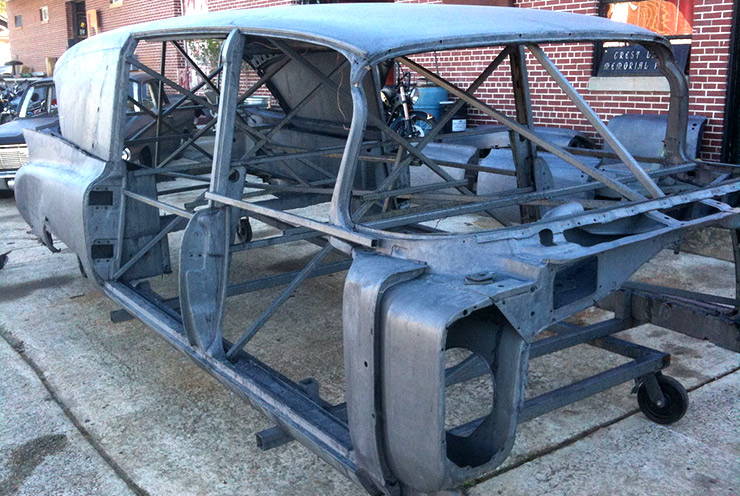 Stripped and braced. The bracing helps maintain squareness while the bodywork begins.