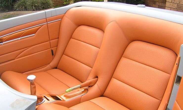 One of Mike’s favorite aspects of HAND MAID is the swoopy, laid back grille, which required several jigs and a couple of hundred hours to construct. Starting with flat, stainless steel plate, each bar was waterjet cut then individually bent into shape before being clamped in perfect alignment for welding. The surround started as an aftermarket fiberglass piece that Mike kept modifying until he got it looking like he wanted – he then took a mould from the modified one to fashion the final piece. Behind this very special grille is 350 Chev crate engine topped with a pair of Edelbrock twin fours. In Mike’s words the engine is nothing fancy, just a bit of dress-up gear and a cam to give it a tough sound. Behind the Chevy V8 is a TH700 and a Series II Jag IRS.All the unnecessary casting lumps and bumps were shaved before the rest was meticulously smoothed and polished to give the 35-year-old design a modern look. Propping up the corners is Foose 18×10, 17×8 rollers, while muscle car-style Auto Meter gauges fill the all-steel dash.