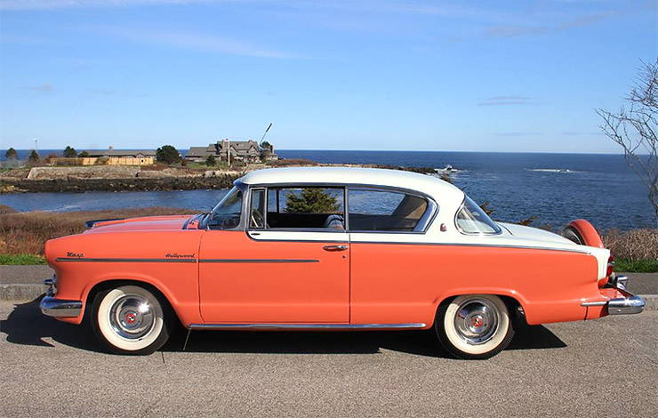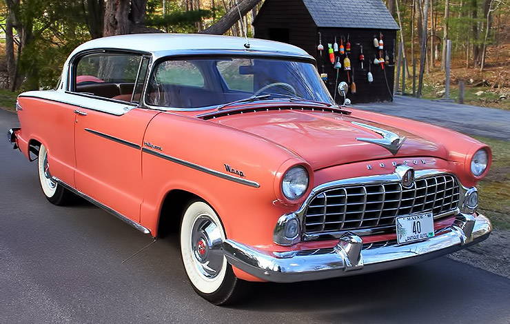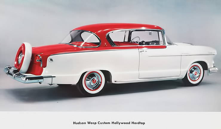 Interestingly, despite their low sales a prospective purchaser could choose from three distinct Hudson Hollywoods in terms of engines for 1955: the Custom Wasp used the old Jet flathead six for motive power, and probably was not exactly neck-snapping in its zero to 60 times; the Custom Hornet carried the grand old Hornet six from previous Hudsons; and the Custom Hornet V-8 used the new Packard V-8. Unlike most cars of that time that offered a choice of sixes and V-8s, the Hornet Hollywood with the six has more collector value than the V-8-equipped cars. There are two reasons for this anomaly: first, the six has more collector appeal to the Hudson purist; and second, the first Packard V-8s with their Twin Ultramatic transmissions—mandatory on V-8-equipped Hornets—were trouble-prone units. Click here if you want to learn more about 1951–1954 Hudson Hornet.