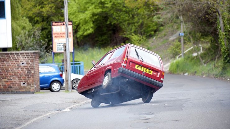 The Reliant Robin is a three-wheeled car that falls under motorcycle registration in the UK, allowing young, unlicensed drivers to drive a vehicle with better weather protection than a motorcycle – just don’t call it a car, by UK law. One notable trait of the Reliant Robin is its instability; they’re prone to roll-overs with their narrow track width, three-wheel design, and weight balance.