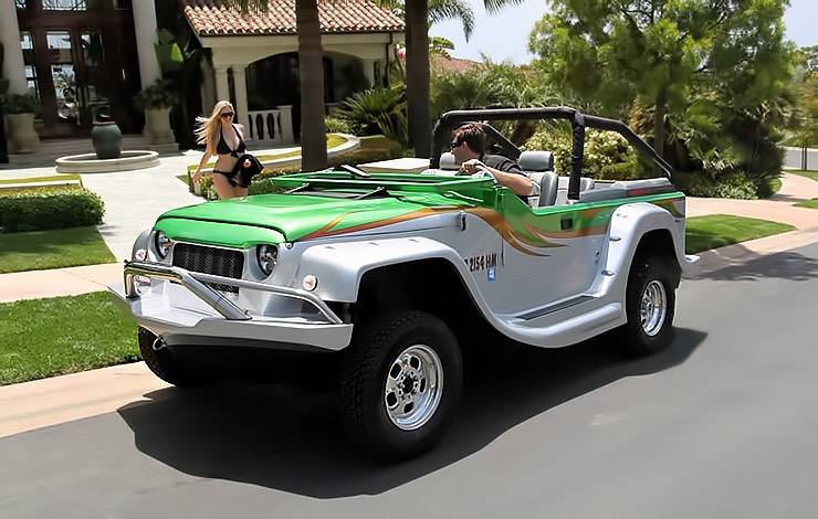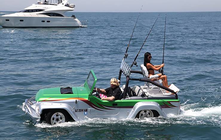 Other stats? Not under the hood is a Honda 3.7L V6 (rear engine). It’s around 280 hp and 305 lb-ft of torque. Before the Honda engine, the WaterCar folks tried the LS1, LS3, and LS7. They made too much power for the axle, driveshaft, and other lighter-weight components. The four-speed standard trans (there’s no automatic option; adds too much weight) comes from a Volkswagen bus. The rear features quick-change gearing like you’d find in a race car. A bilge pump, Yokohama/Weld rubber/rims, and lots and lots of rustproofing are also part of the package.Despite the Jeep CJ-8 looks, it’s really best suited for very light off-roading, like the small amount of sand leading to the launch pad; the transfer case is a single-speed patented Panther Jet model. To build one, it spends two weeks in a fiberglass shop becoming a body, then it takes around three weeks to build the rest. The exhaust system was the biggest challenge for WaterCar, as in street legality—there’s no catalytic converter. The other issue was how to cool the WaterCar on land, since the radiator couldn’t be up front with the benefit of airflow running through it, so a system of air ducts/fans was built. Fuel economy on land is around 24 mpg; in the water it depends on how you drive it, but figure around 2½ mpg. If you’ve hopped up anything that’s not a car, let’s see it! Hot leaf blower? Bitchin’ gas grill? Customized kitchen cabinets? Anything goes.