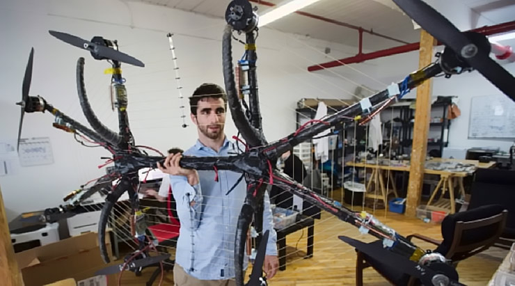 The Omni Hoverboard has eight propellers and a frame made from carbon fibre. The motors controlling the propellers are powered by 12 lithium polymer batteries, that generate about 40 horsepower, but the combined flying time is just 1.5 minutes. The acceleration is achieved by squeezing a joystick made from a pair of pliers and allows the hoverboard to go higher or lower, slower or faster. The user is securely anchored to the hoverboard with snowboard binding straps and steers the board by physically turning in the air to change its direction.