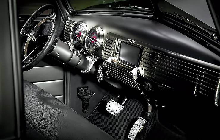 “The dashboard was one of the most challenging pieces to the truck,” says Jonathan, “We wanted to make it as clean as possible and hide all the switches, knobs and levers.” They turned to their friends at Kenwood and ISIS to provide a head unit and wiring harness that could act as the main controller for all the electronics in the car. You can control everything from the hidden touch screen or an iPhone application that is tied to the truck. You can start the car, roll down the windows, turn on the window wipers and unlock the doors with the phone. Hopping in the cabin you can see why they opted for a clean interior. It just looks fantastic without all the clutter. The dash centerpiece is the art deco lines of the nickel plated trim not some huge 8-track stereo system with faded yellow buttons. Both the glove compartment and the head unit covers are easy to access with a light press on the top of their panels. The doors swing out and float down with a smooth motion granted by the tiny RC shocks and magnets. “I added the magnets after we finished with panels,” explains Jonathan, “because [before] they would stop with a bang; the magnets let them glide into place.” A restored truck is always nice to look at. But a restomodded one is just so much cooler! To learn more about the Thriftmaster, visit ICON at http://icon4x4.com.