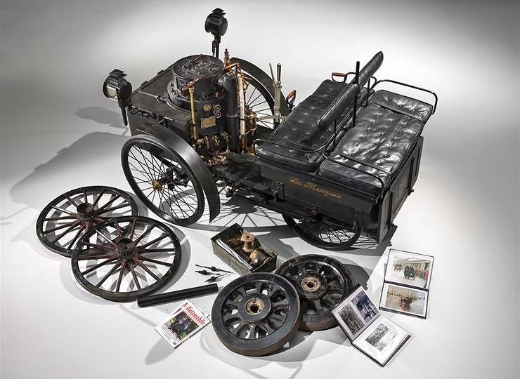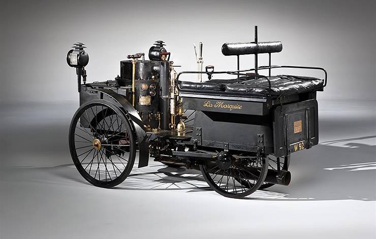 The 1884 De Dion steamer was nicknamed ‘La Marquise’ after the Conte de Dion’s mother. Measuring just nine feet in length, ‘La Marquise’ features twin compound steam engines, ‘spade handle’ steering and seats four people ‘dos-a-dos’ (back-to-back). The seats are located on top of the steel tank, which holds 40 gallons of water. The engine was mounted in the front, driving the front wheels and steering in the rear wheels.