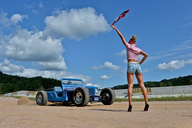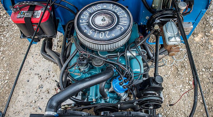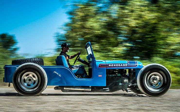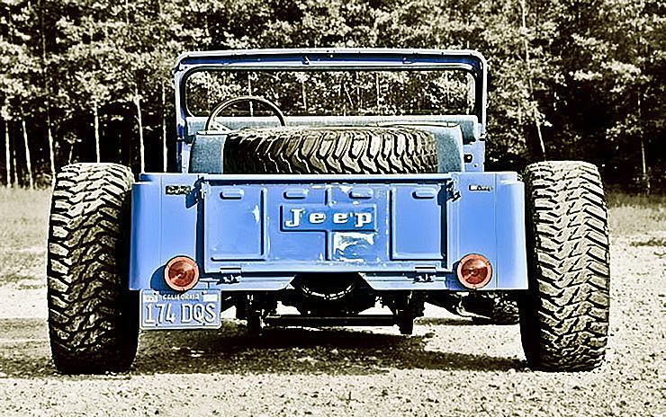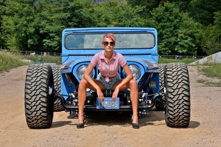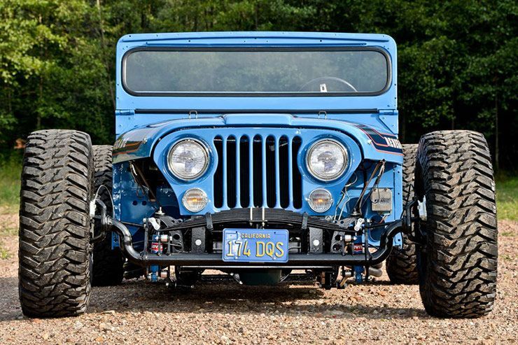 A Dana 44 serves as an organ donor for this Jeep Hot Rod. Hubs, disc brakes and calipers. Everything is nicely implemented so it can be perfectly adapted to the rear axle. All the steering linkage is home made. The front of the Levi’s Jeep is equipped with just one leaf spring taken from Ford model A. It is mounted upside-down. It was of utmost importance to keep the original CJ wheels. They’ve been polished and equipped with Cooper STT tires (35 inch size) The engine is a V8 of course. It’s a 5900 cc (360 ci) from a 1972 Jeep Wagoneer, completely revised of course. The gearbox is manual, model T176 from a 1980 Cherokee. Only one driveshaft though. It has only one drive shaft for the rear.Front fenders have been removed, the windshield is lowered and the grille has also been adapted to follow the harmonious proportions and smooth lines of this Jeep CJ hot rod.