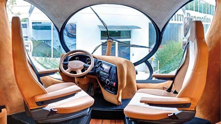 The RV looks like it came straight from a sci-fi flick. Palazzo’s revolutionary cockpit features an aviation dashboard equipped with all the buttons and switches you need on hand. Its helicopter panoramic-glazing windows give you a wide view of the road, and their shade levels darken at the push of a button.