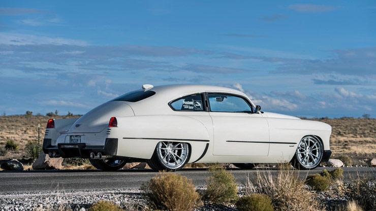 They used an ATS-V instead of a V8 CTS-V as a donor because of the track width. They cut the body off one ATS-V and stretched the naked chassis 14 inches. Then, they painstakingly set about installing the heavily massaged body panels from a 1948 Cadillac Series 62 Coupe on the modern underpinnings.