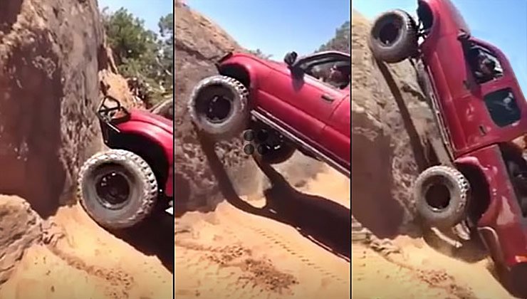 This pickup truck achieved an incredible feat when it attempted to climb up an almost vertical rock that spells out rollover pretty clearly in big and bold letters.