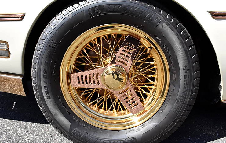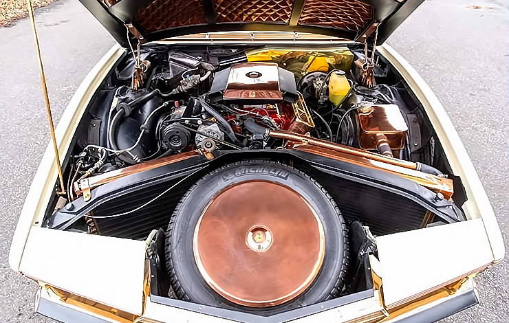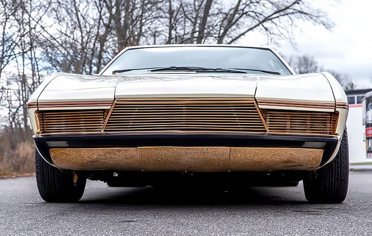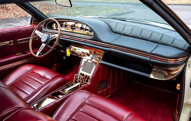 Based on a Buick Riviera chassis and built by Italian coachmaker Coggiola Carrozziere at a cost of $150,000 (about $1,420,000 today), the Exemplar I is swathed in brass and copper inside and out – with a reported eleven different shades of yellow and gold alloys to add contrast. From the bumpers, grille, and custom Borrani wire wheels to the instrument panel, console, and even control knobs and switches, the look of polished brass and copper is everywhere.