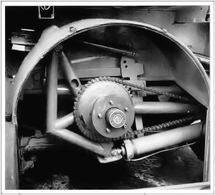 CHAIN DRIVE like a bicycle’s takes power from the drive shaft and turns wheel after has been lowered to ground by hydraulic cylinders behind chain