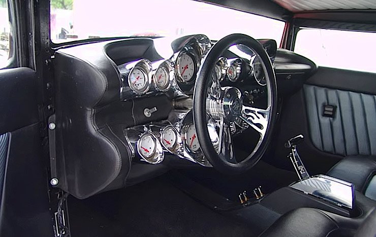 The interior of this Hudson consists of real leather and carbon fiber vinyl. It has an exceptional amount of room and is extremely comfortable. The 59 Impala instrument panels are in excellent condition with no pitting nor any issues. Everything works exceptionally well. The shifter is a B&M. The Hudson has power windows as well as a backup camera which is mounted to a 7″ LCD under the dash.