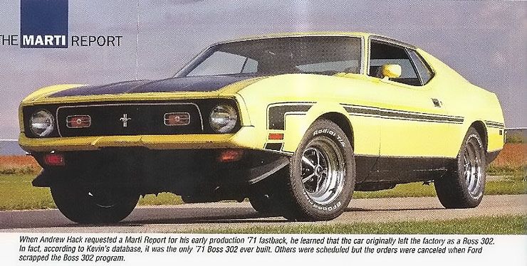 Actually, according to Kevin Marti, in his interview with Mustang Monthly Magazine, this car is the only one leave the Dearborn plant. It was actually the “Pilot” Boss 302 car, built on the first day of regular production of the 1971 Mustangs. The others that were scheduled for build, were cancelled, some were even “bucked” and cancelled.