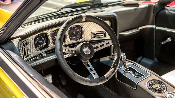 Well, to begin with, the car has been restored to mere perfection and everything you see on it looks utterly gorgeous. Much of the body is carbon fiber. The hood, front fenders, grille, and front valance are sculpted of the lightweight material, and should bring the base Javelin’s 2,875-pound weight down significantly. The Defiant rides on a custom front subframe that holds modernized steering, sway bars, and RideTech suspension components.