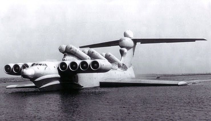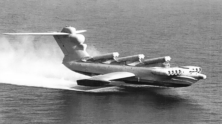 Ekranoplan is a Russian word, it means ‘screen craft’ or ‘skimmer’. It is not a plane nor is it a ship, its more like a mixture of both. The Ekranoplan travels along on a dynamic cushion of air that is generated by its forward movement, and with eight powerful turbofan jet engines it can reach a high rate of knots.