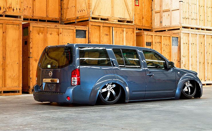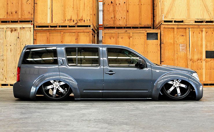 The rear seats were removed to make way for the extensive sheetmetal work, including the entire floor. To accommodate the monstrous 24×9.5-inch KMC Brodie wheels, the firewall, door jams and rear doors had to be tubbed. Sean’s Pathfinder is dumped on Slam Specialties airbags; the chassis acts as the air tank and has been pressure-tested to 200psi. More specifically, they’re RE-6s in the front with custom adjustable plate arms. Out the back, RE-7 airbags work with the hole-sawed I-beam canti-lever set-up for the one-off, adjustable sleeved 4-link rear-end. The standard diff was shortened 50mm on either side, while the modified steering uses two Flaming River steering knuckles and a heim joint. There are one-of-a-kind adjustable upper arm plates, plus adjustable tow-in and toe-out on the bottom arms.These “true” minitruck builders definitely know what it takes when it comes to custom fab work, its truly amazing what they are doing. 110% awesome, it doesn’t need a purpose, it’s just cool and showcases clever fabrication.
