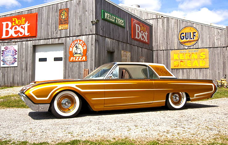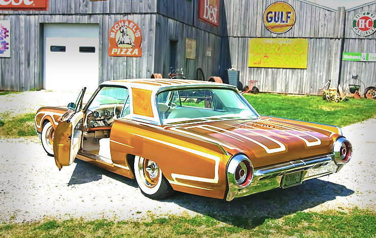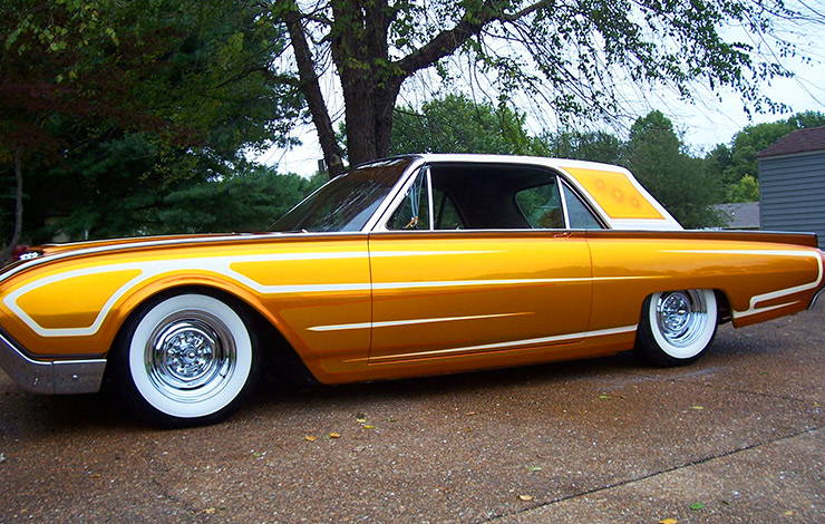 The Thunderbird was a huge success and little change is needed to keep it that way, as you’ll notice while reading the build sheet for Eddie Rochelle’s 1962 T-Bird.With its sound body and running gear, Eddie was able to focus on making the car stand out in a crowd. Thanks to John Christensen’s handiwork and a fabulous coat of House of Kolor Pagan Gold, I assure you it will not go unnoticed. While John was busy spraying, custom graphics were applied. For added measure, the outside combination was carried to the color matched wheels and inside to the console. Coker wide whites were mounted and FE Specialties did a number on the engine. Reed’s Custom Interior got the call for the pearl white seat and padded dashboard. Eddie drives the wheels off this car and for good reason. His wife Sarah has already made claim to a set of chrome reversed wheels she swears will be on “her car” if it ever sits still long enough. Drive it, brother! The car looks awesome just the way it is.